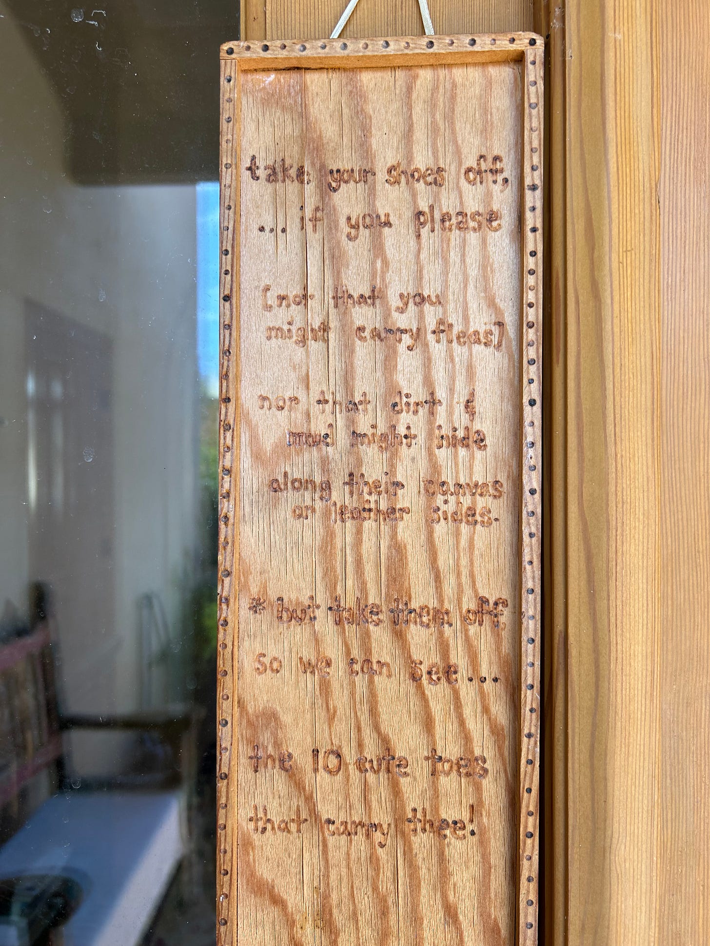 When I was little, my mother had a fetish for white carpets. Never mind there were 4 kids under 12 in our house. If we got so much as a speck of dirt on that carpet, we were spanked. Any wonder we learned to take our shoes off at the door? Ever since, I’ve hung this poem of mine, which my oldest engraved in wood, on the front door of every home I’ve lived in. My kids often balked at having to take their shoes off. When they were teenagers, and I kept clean socks by the door for their friends to put on, there was significant eye rolling.